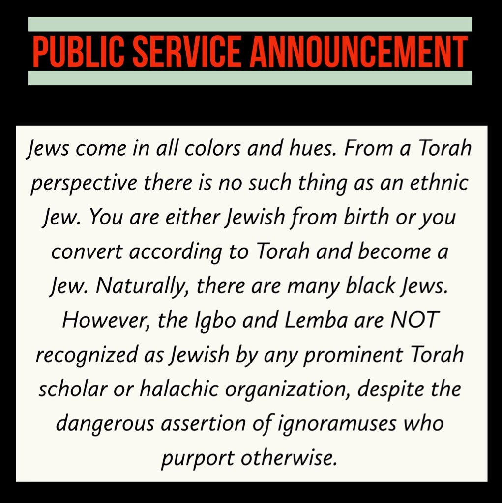 Contrary to the false narratives of online ignoramuses, the Lemba & Igbo people are NOT Jewish according to Halacha, which is the only standard that matters when determining the question - “who is a Jew”?